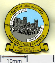 Scope and ContentBlue, White, Yellow, Grey. Durham Miners Gala. Durham Area NUM. Proud of our Heritage our Traditions continue. 20 years on Miners Strike 84-85. 2004. ill Gala March with banner and Colliery Brass Band marching past Durham Cathedral. Reverse = 7 of 275.