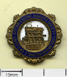 Scope and ContentEnamel badge with an image of a steam engine and the text: Steam Engine Makers Society. United we stand divided we fall.
