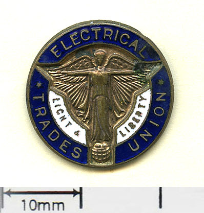 Scope and ContentEnamel badge with an image of an angel standing on a globe and the text: Electrical Trades Union. Light and Liberty.