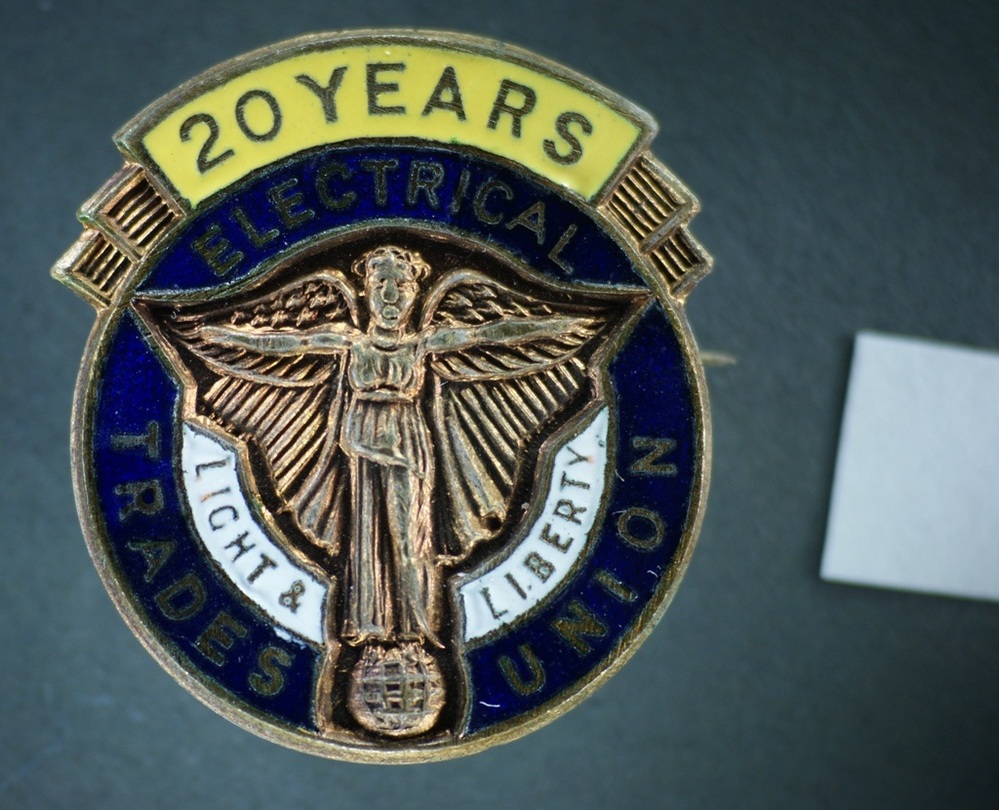 Scope and ContentEnamel badge with an image of an angel on a globe and the text: Electrical Trades Union. 20 years. Light and Liberty.