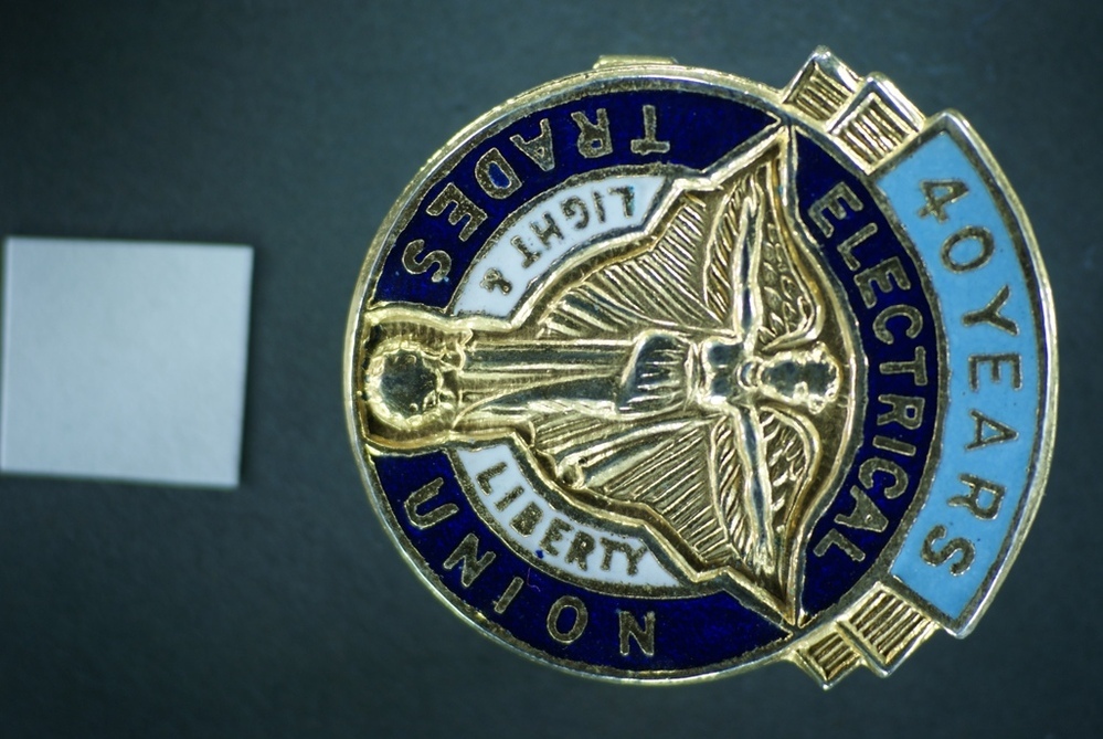 Scope and ContentEnamel badge with an image of an angel standing on a globe and the text: Electrical Trades Union. 40 years. Light and Liberty.