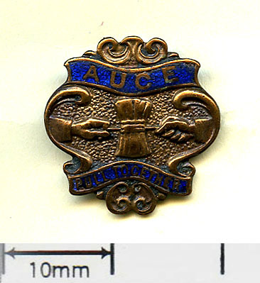 Scope and ContentBase metal brass, Blue. AUCE (Amalgamated Union of Co-operative Employees). Pull together. ill. 2 hands pulling cord round sheaf of corn.