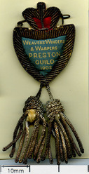 Scope and ContentFabric Badge with gold tassels. Gold, Blue, Red shield shape with crown. Weavers, Winders and Warpers. Preston Guild. 1902.