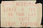 Scope and ContentBlack background with illustration of a starving child wrapped in a blanket. The text above reads: They face famine in Spain. They need clothes. The text below reads: Winter relief urgently needed. National Joint Committee for Spanish Relief. The illustration is signed by Felicity Ashbee. On the rear there is a handwritten notice reading - Spain needs milk. Leave a tin on your way home from shopping