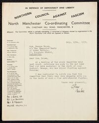 Scope and ContentTypewritten condolence letter from from the Northern Council Against Fascism to Evelyn Brown regarding death of her husband