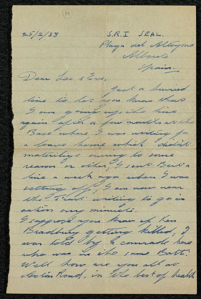 Spanish Civil War: Clifford Wolstencroft, biography file - letter, 25 Feb 1938