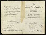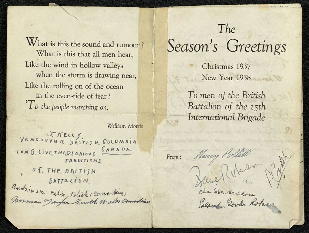 Scope and ContentChristmas card to the men of the British Battalion and signed by many people. Note on front states: Sent by Clifford Wolstencroft - a fighter in Spain