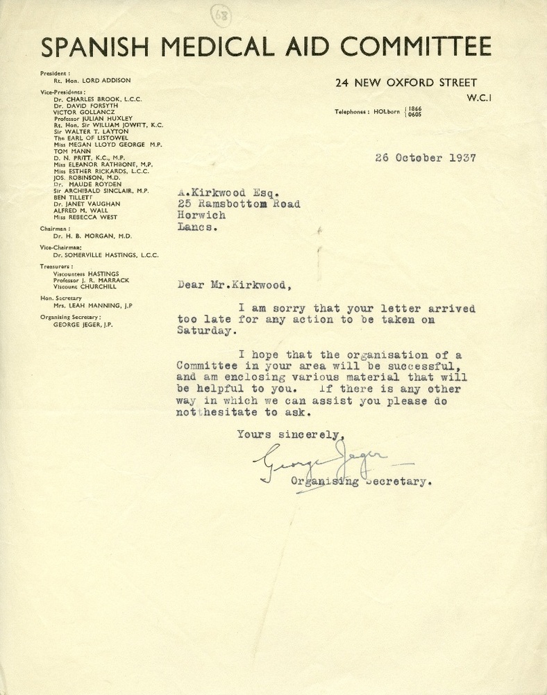 TitleSpanish Civil War: Spanish Medical Aid Committee - letter, 26 Oct 1937