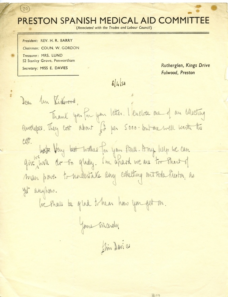Spanish Civil War: Spanish Medical Aid Committee, Preston branch - letter, 6 Apr 1938