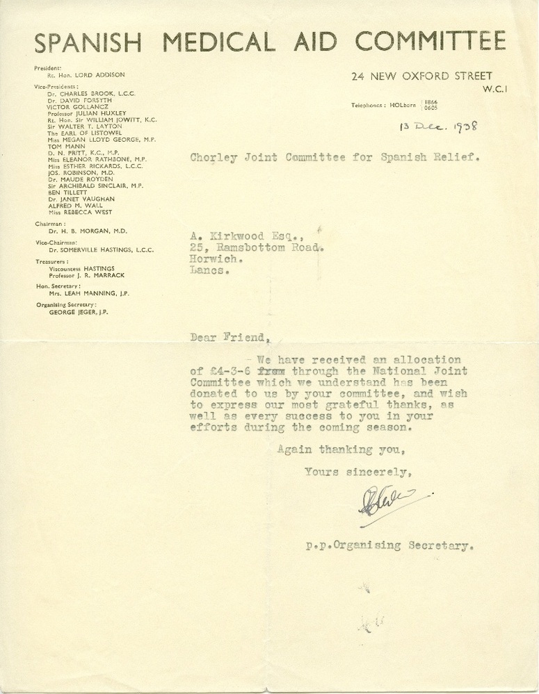Spanish Civil War: Spanish Medical Aid Committee - letter, 13 Dec 1938