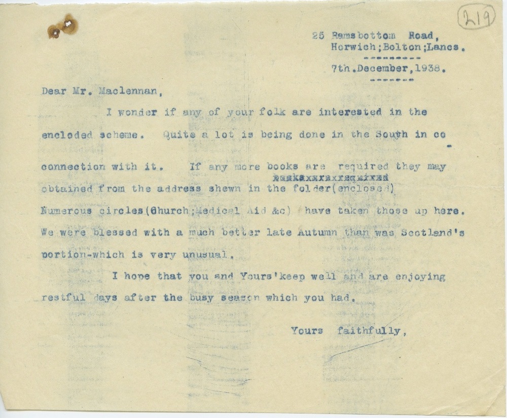 Spanish Civil War: Manchester Foodship for Spain, Horwich and District Committee - letter, 7 Dec 1938
