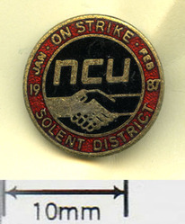 Scope and ContentRed, Gold. Text -ncu On Strike Jan-Feb 1987, Solent District. Illustration - clasped handshake.