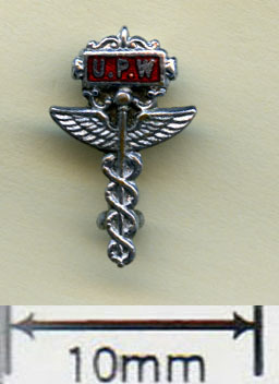 Scope and ContentEnamel badge in the shape of a Caduceus with the text: UPW