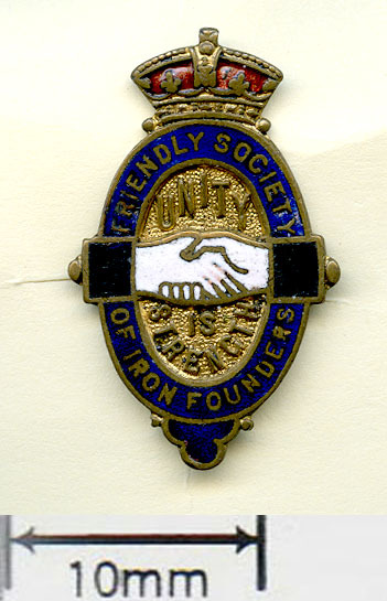 Scope and ContentBlue, Gold, White. Text - Friendly Society of Iron Founders, Unity is Strength. Illustration - crown, clasped handshake