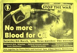 Scope and ContentPoster with an image of a child with a petrol nozzle to his head and the text: No more blood for oil. Saturday 8th March, 1pm. Three marches: one message. Join together for peace rally and festival: 3pm Albert Square, Manchester. With details of the starting points of the three marches
