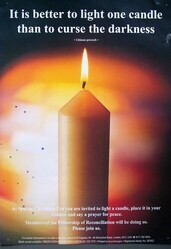Scope and ContentPoster with an image of a candle and the text: It is better to light one candle than to curse the darkness. Chinese proverb. At 9pm on Christmas Eve you are invited to light a candle, place it in your window and say a prayer for peace. Members of the Fellowship of Reconciliation will be doing so. Please join us