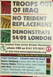 Scope and ContentPoster with the text: Troops out of Iraq. No Trident replacement. Demonstrate 24/02 London. Public meeting. Stop Trident. Troops out of Iraq. Walter Wolfgang (Labour Party NEC and CND), Yvonne Ridley (Political Editor, Islam Channel), John Rees (Stop the War Coalition). 7.30pm, Wednesday 14th February 2007. Mechanics Institute, Princess Street, Manchester
