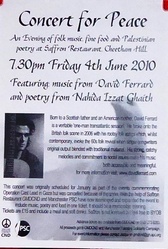 Scope and ContentPoster advertising a Concert for Peace to take place at Saffron Restaurant, Cheetham Hill at 7.30pm on 4 Jun 2010 and organised by Greater Manchester CND and Palestine Solidarity Campaign.