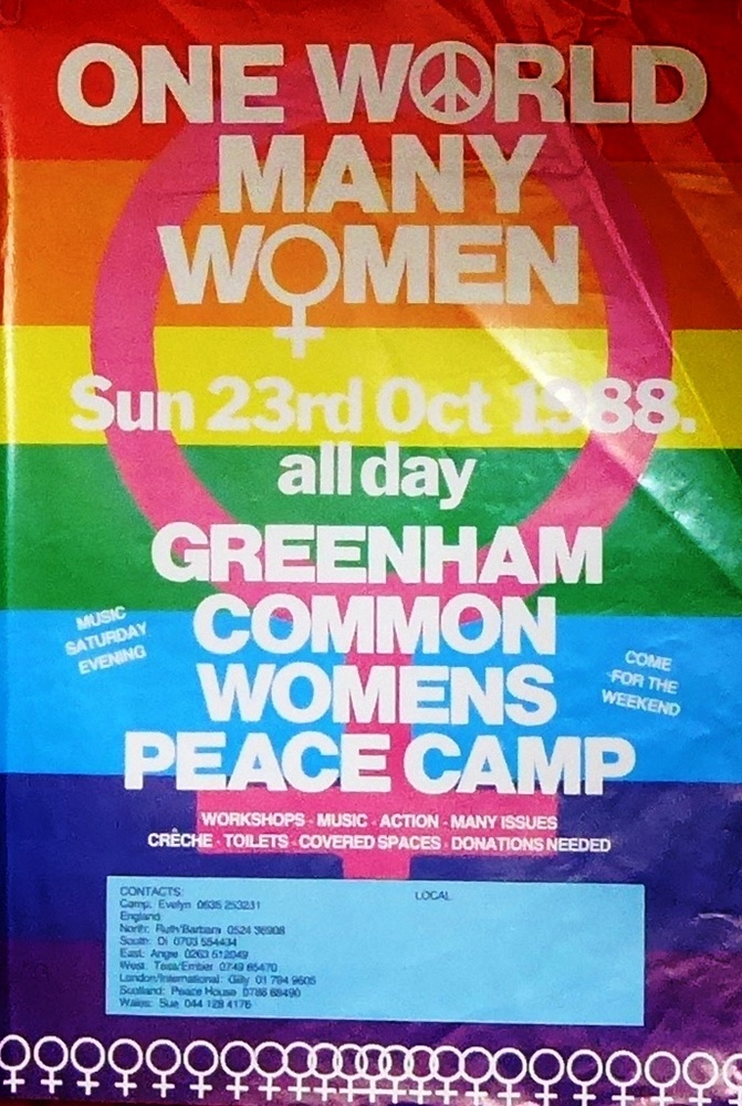 Scope and ContentPoster with the text: One world, many women. Sun 23rd oct 1988. All day. Greenham Common Womens Peace Camp. Workshops, music, action, many issues. Creche, toilets, covered spaces, donations needed.