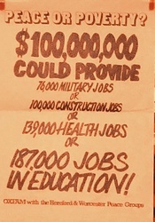 Scope and ContentPoster with the text: Peace or poverty? $100,000,000 could provid 76,000 military jobs or 100,000 construction jobs or 139,000 health jobs or 187,000 jobs in education! Oxfam with the Hereford and Worcester Peace Groups