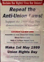 Scope and ContentPoster with the text: Reclaim our rights! Free our Unions! Repeal the anti-union laws! Support the 1999 May Day demonstration in London! Organsied by the London May Day Organising Committee. Saturday 1st May 1999. Assemble 12 noon Clerkenwell Green, London. March leaves 1pm. Rally in Trafalgar Square 3pm. Speakers include Tony Benn MP and Arthur Scargill. Make 1st May 1999 Union Rights Day.