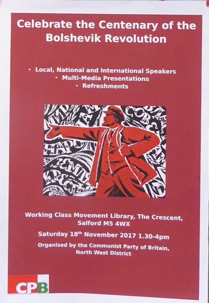 Scope and ContentPoster advertising a meeting held at the Working Class Movement Library with the title: Celebrate the centenary of the Bolshevik revolution. Organised by the Communist Party of Britain, North West District