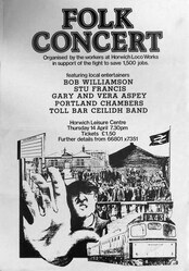 Scope and ContentFolk concert organised by the workers at Horwich Loco Works in support of the fight to save 1,500 jobs. Featuring local entertainers. Horwich Leisure Centre, 14 Apr [no year]
