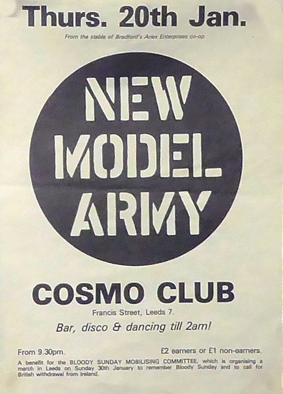 Scope and ContentPoster with the text: Thurs 20th Jan. New Model Army. Cosmo Club, Francis Street, Leeds 7. Bar, disco and dancing till 2am! From 9.30pm. A benefit for the Bloody Sunday Mobilizing Committee which is organising a march in Leeds on Sunday 30th January to remember Bloody Sunday and to call for British withdrawal from Ireland