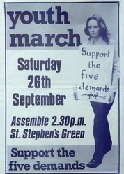 Scope and ContentPoster with an image of a woman holding a placard reading Support the five demands and the text: Youth march. Saturday 26th September. Assemble 2.30pm St Stephens Green. Support the five demands
