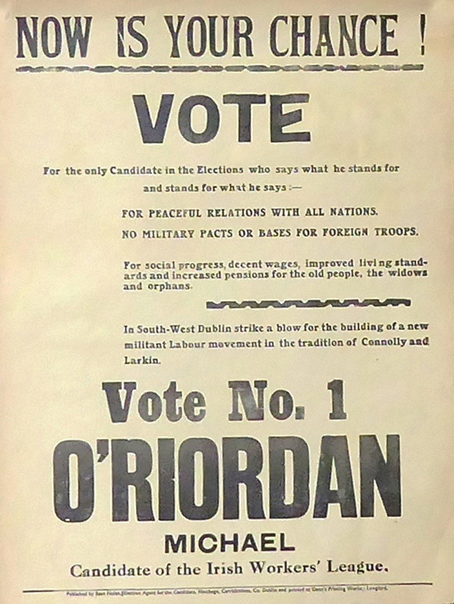 Scope and ContentPoster with the text: Now is your chance! Vote for the only candidate in the elections who says what he stands for and stands for what he says: For peaceful relations with all nations. No military pacts or bases for foreign troops. For social progress, decent wages, improved living standards and increased pensions for the old people, the widows and orphans. In South-West Dublin strike a blow for the building of a new militant labour movement in the tradition of Connolly and Larkin. Vote no 1, O'Riordan, Michael. Candidate of the Irish Workers' League.