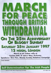 Scope and ContentPoster with the text: March for peace through British withdrawal on the 25th anniversary of Bloody Sunday. Saturday 25th January 1997, 12 noon, London. March to an indoor rally at Caxton Hall, St John's Way, Archway. Speakers: Sinn Fein, Bloody Sunday Relatives Campaign. Self determination for the Irish people. Organised by the Bloody Sunday March Organising Committee