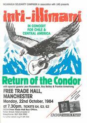 Scope and ContentPoster advertisng a concert by Inti-Illimana in support of Chile and Central America, with Leon Rosselson, Roy Bailey and Frankie Armstrong to be held at the Free Trade Hall, Manchester on 22 Oct 1984