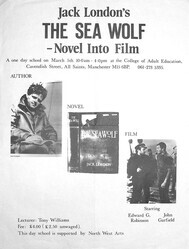 Scope and ContentPoster with images of Jack London, the front cover of The Sea Wolf and a still from the film and the text: Jack London's The Sea Wolf. Novel into film. A one day school on March 5th 10.0am-4.0pm at the College of Adult Education, Cavendish Street, All Saints, Manchester