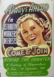 Scope and ContentPoster with an image taken from a union poster and the text: Behind the counter. A century of shopworkers. 15 June - 29 September 1991. National Museum of Labour History, Manchester