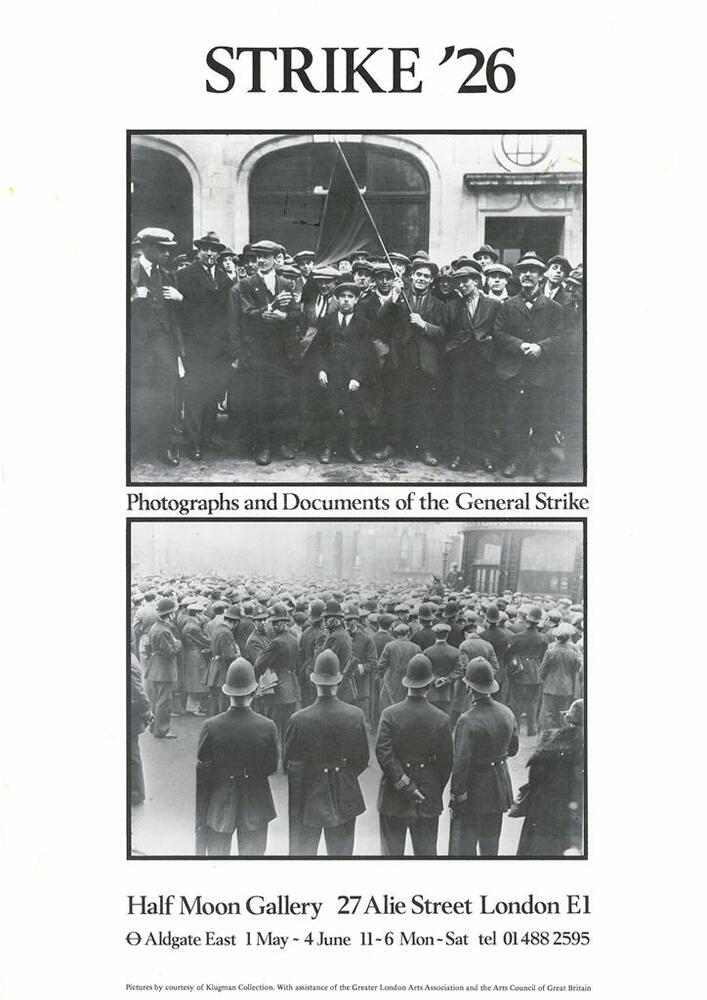 Scope and ContentPoster with two images of the General Strike and the text: Strike '26. Photographs and documents of the General Strike. Half Moon Gallery, London
