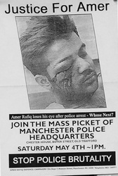 Scope and ContentPoster with an image of Amer Rafiq and the text: Justice for Amer. Amer Rafiq loses his eye after police arrest. Whose next? Join the mass picket of Manchester Police Headquarters, Chester House, Boyer Street, Old Trafford. Saturday May 4th 1pm. Stop police brutality
