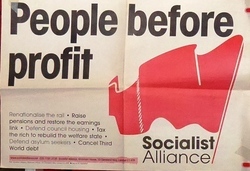 Scope and ContentPoster with the text: People before profit. Renationalise the rail. Raise pensions and restore the earnings link. Defend council housing. Tax the rich to rebuild the welfare state. Defend asylum seekers. Cancel Third World debt.