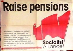 Scope and ContentPoster with the text: Raise pensions. Pensioners have been treated with contempt by the Tories and New Labour. If the link between pensions and earnings was restored, state pensioners would be £30 per week better off. The Socialist Alliance says restore the link - give all our pensioners a decent income.