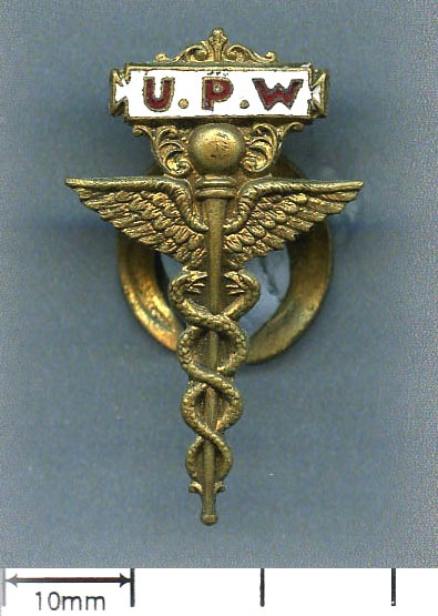 Scope and ContentEnamel badge in the shape of a Caduceus and the text: UPW. Reverse: Reg 632818