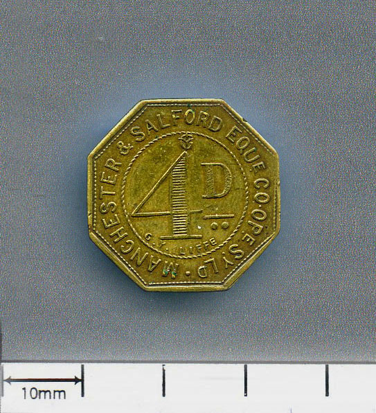 Scope and ContentBrass. Manchester and Salford Equitable Co-operative Society Limited. 4d G. Y. Iliffe. Duplicate Reverse. (Check)