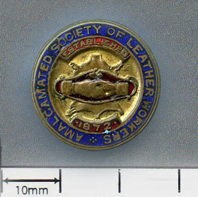 Scope and ContentEnamel badge with images of clasped hands and a leather hide and the text: Amalgamated Society of Leather Workers, Established 1872.