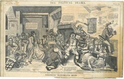 Scope and ContentEngraving by Charles Jameson Grant subtitled: Our Artist has hit off the dilemma in which poor John Bull is placed every year. First he is thrown from Tory to Whig, and then from Whig to Tory; but the two factions cease their game of shuttlecock when the time for the supplies is at hand; then the old game of Blindman's Buff is, as above proceeded with, and Honest John has again to cast his skin of Golden Scales to the tune of £52,000,000