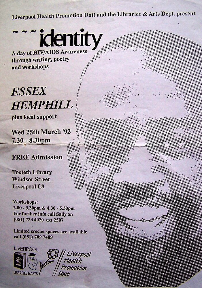 Scope and ContentPoster with an image of a smiling man and the text: Liverpool Health Promotion Unit and the Libraries and Arts Dept. present Identity - a day of HIV/Aids awareness through writing, poetry and workshops. Essex Hemphill, plus local support. Wed 25th March '92. Free admission. Toxteth Library, Windsor Street, Liverpool L8. Workshops