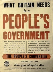 Scope and ContentPoster with the text: What Britain needs is a people's government. Under the present Government, not a plane, or a gun, or a ton of coal, or a pound of sugar is produced unless there is a handsome profit. This is not the way the people's interests can be defended. Our future and the world's depends on establishing a Government truly representative of the British people. The responsibility rests on workers' organisations. Your chance to discuss what steps must be taken will be provided at - The People's Convention. January 12th 1941. Elect your delegates now.