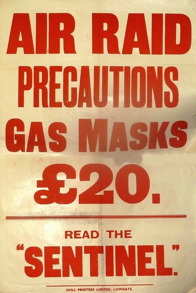 Scope and ContentHull Sentinel headline hoarding with the text: Air-raid precautions. Gas masks £20. Read the Sentinel [Aug 1935?]