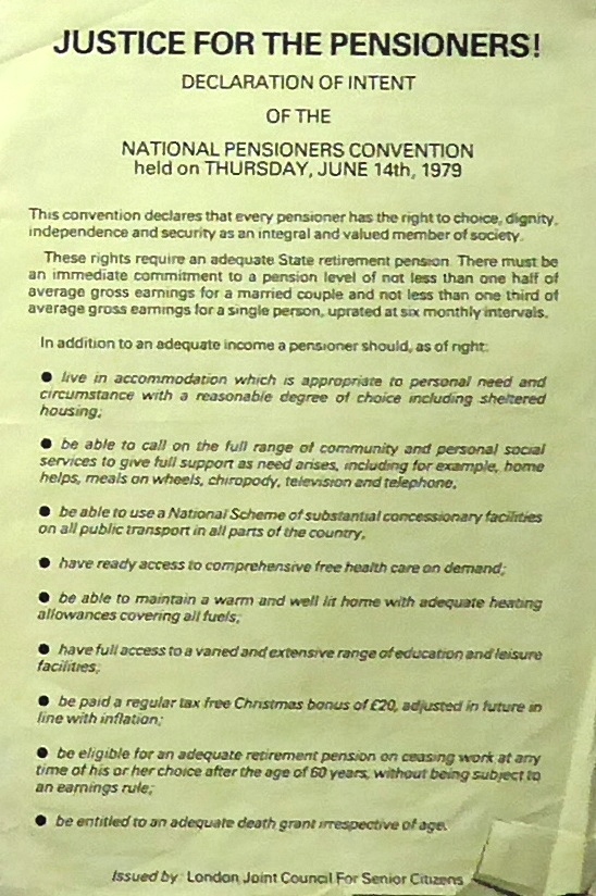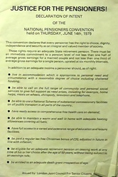 Scope and ContentPoster headed Justice for Pensioners! with the declaration of intent of the National Pensioners Convention held on Thursday June 14 1979