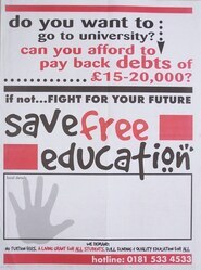 Scope and ContentPoster with the text: Do you want to go to university? Can you afford to pay back debts of £15-20,000? If not ... fight for your future. Save free education