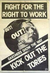 Scope and ContentPoster with an image of Margaret Thatcher and the text: Fight for the right to work. Gardners shows the way. Kick out the Tories