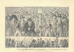 Above the design, 'Publish'd for the History of the Westminster & Middlesex Elections, Novr 1806', and a folding pl. from the book. A section of the hustings extends across the design, bisected by one of the vertical posts supporting the (invisible) roof. On this are two placards: 'Loyal Parishes of St Paul's and St Giles's' and 'State of the Poll -. Paul - Hood - Sheridan'. The base of the design is formed by the heads and raised arms of the mob below. Hood and Sheridan, with their supporters, are on the left of the post, Paull and his supporters on the r. The supporters wear favours with the names of their candidates. On the extreme left. is a stout man holding a whip. Next, Hood in uniform, with his empty r. sleeve, turns in profile to the left, away from Sheridan, putting his hand to his mouth to cover a smile. Sheridan stares in bewildered an speechless anguish, horrified at the shouts of the mob and at Paull's words Whitbread, standing behind, puts his left hand reassuringly on his shoulder and offers him a foaming tankard inscribed 'Whitbread new Loyal Porter'. His is 'Hood & Sheridan'. On Sheridan's l. a dog, its collar inscribed 'Peter Moore', barks savagely at Paull, who stands hat in hand, r. arm extended towards Sheridan, addressing the crowd: " - the sunk, the lost, the degraded Treasurer" [Sheridan]. On Paull's l. is Burdett; next, and on the extreme right., is Bosville. Between and behind Paull and Burdett stands Cobbett, holding an issue of the 'Political Register' on which the word 'Cobbett' is legible. These three have tickets inscribed 'Paull' in their hats. Behind Paull on the left, and watching him, stands the Duke of Northumberland. He holds a paper: 'To the Vestry of St Margaret'; in his hat is 'No Coalition'. Behind these first two rows on the hustings, heads recede until they merge in shadow. Three men behind Sheridan appear to be portraits; two have favours inscribed 'Sheridan'; the third is a man in uniform wearing a plumed death's head cap and a gorget. He is Downes, an undertaker, and a major in the St. James's Volunteers: there were shouts of 'no major Downes the undertaker'. The rank and file of Sheridan's supporters look anxious, those of Paull are grinning.
