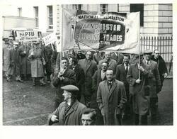 Scope and ContentBlack and white photograph of a demonstration in Manchester. The National Federation of Building Trades Operatives, Manchester Branch banner is being held aloft in the foreground with other union placards being held aloft behind. Details of some of the participants on rear of image.